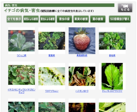 病害虫の診断コーナーに新しい目次が加わりました。 写真を見ながら,病気・害虫を選択するだけのどなたにも分かりやすい目次です。