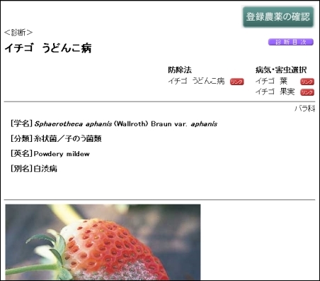 さらに,それぞれの記事ページの右上についた「登録農薬の確認」ボタンを押すと, それぞれの病気・害虫に登録のある農薬一覧へと移動します。
