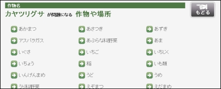 ◎畑地雑草などでは,作物ごとに登録されていることが多いため,下のような作物選択の画面が一度開きます。 調べたい作物を選んでボタンを押すと,除草剤一覧に移動します。