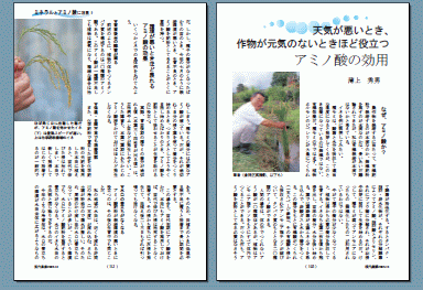 ●再掲 「日照不足対策・農家の工夫」のページ(2006年5月作成) アミノ酸は,作物が弱っているときや,天気が悪くて光合成がすすまないといったときに効果が高いが,味をよくしたいとか,さらに作物を元気にしたいといったときにも用いられる。『現代農業』では,これまでもアミノ酸のさまざまな活用例をとりあげてきた。天候不順が続く今年。読み返してみてはいかがだろう。