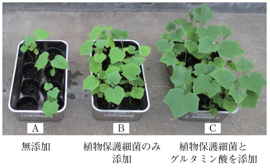 写真2はピシウム病菌が蔓延する土壌でキュウリ幼苗を栽培したもの。植物保護細菌を添加しない区画(A)に対して、植物保護細菌を添加した区画(B)では幼苗の生育に回復がみられ、植物保護細菌とグルタミン酸を添加した区画(C)では生育量が2倍に増大。竹内香純氏(農研機構生物機能利用研究部門)がグルタミン酸と植物保護細菌の併用によってキュウリ苗立枯病が抑制されることを解説しています。