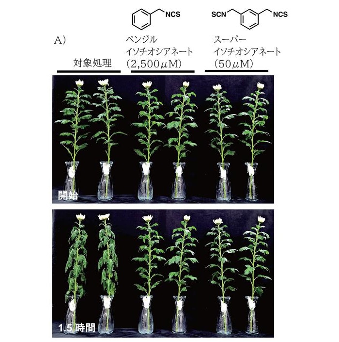 たとえば、アブラナ科の辛味成分イソチオシアネートに植物の気孔開口の抑制作用があることを相原悠介氏(神戸大学)と木下俊則氏(名古屋大学)が明らかにしました。写真1はキクの葉をイソチオシアネート類化合物溶液に浸けたあとに3時間光処理し、断水を1.5時間行なったあとの状態(左の2つは無処理)。イソチオシアネート類を処理したキクでは、1.5時間の断水でも、しおれが抑えられました。