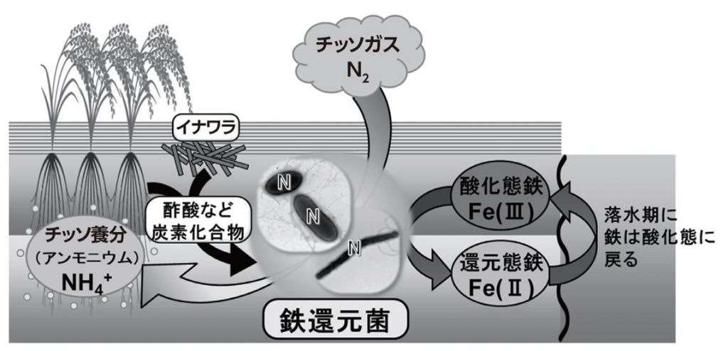 イネにおけるチッソ固定菌の一つは鉄還元菌。鉄還元菌はイナワラの分解産物の酢酸と、水田土壌に含まれる鉄をエネルギー源としてチッソ固定していることを妹尾啓史氏ら(東京大学)が明らかにしました。水田土壌における圃場試験でも、土壌表面に農業用純鉄粉を散布したところ、チッソ固定が増強され、チッソ無施肥でも慣行施肥と同等以上の生育が得られる場合があったとのこと。このほかにも、メタン酸化菌が水田に豊富にあるメタンガスをエネルギー源にしてチッソ固定していることを南澤究氏(東北大学)が解説しています。