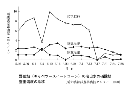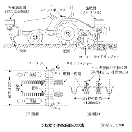 琵琶湖の水質が取り沙汰される滋賀県では,硝酸態窒素をいかに減らすかが大きな問題となっている。ここでは,水田輪換によるイネ─コムギ─キャベツの2年3作のローテーションが行なわれているが,キャベツ作に「うね立て同時作条施肥」が取り入れられ始めている(柴原藤善氏・滋賀県農業総合センター)。緩効性肥料を作条施肥することで施肥効率を上げ,追肥も硝酸イオンメータを用いた簡易栄養診断によって決める。