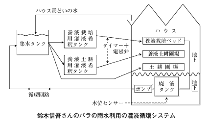 バラ:環境保全型花卉栽培に挑戦 愛知県一色町の鈴木信吾さんは,従来の土耕栽培に加えて,ロックウール耕と点滴灌水を導入している。鈴木さんは,ロックウール耕の廃液をすべて貯水槽に戻して,点滴土耕と土耕栽培の灌水・施肥に再利用するシステムをつくり上げている。用水は全て雨水を利用。さらに出荷でも,バケット輸送に全面転換し,環境保全型花卉栽培に向けて大胆に挑戦している。
