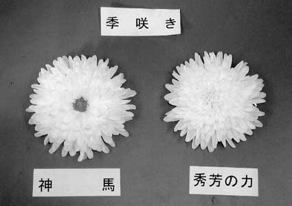 キク:‘神馬’を追加 ‘秀芳の力’に替わる品種として期待される‘神馬’。開花始めから純白,水揚げがよい,低温でもよく伸長する,密植栽培が可能で収量が高いなど利点は多いが,その特性については不明な点が多い。「神馬の性質を」という読者の声に応え,鹿児島農試の仮屋崎義友先生に,試験研究の成果に栽培現場の情報を盛り込んで最新情報を緊急に紹介していただいた。
