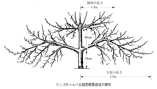 主枝の分岐点を低くして,亜主枝を主幹から一定距離をおいて放射線状に配置。側枝も下垂させず,短く維持した,「傘を下向きに開いたような」樹形。