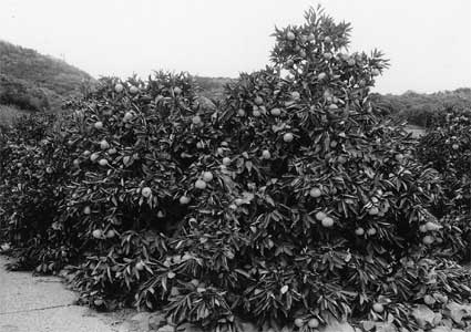 4)カンキツ園は傾斜地が多いだけに,表土流出を防ぐために草生栽培を最も導入したい樹種のひとつ。四国農試の内田誠先生は,ジャクヒゲ,バヒアグラス,ヘアリーベッチなど各種の多年生の草種を検討している。法面の管理に,ビンカ・マジョール,ヘデラなども検討されている。