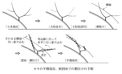 カキの平棚栽培では,脚立なしで摘蕾,摘果,収獲,防除といった一連の作業ができる。しかも,着蕾が安定して生理落果が軽減されて,着果の確保が容易になる。その上,大玉で着色が優れ,汚損果が少ないなど,高品質生産にもつながる。