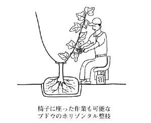 そのつらい作業を大幅に軽減したのが,今回の追録で収録した,ブドウ・ピオーネの「ホリゾンタル整枝」(兵庫中央農技セ・福井謙一郎先生),ナシ・新高の「むかで整枝」(岡山県農試北部支場・磯田道男先生)である。各作業時間が短縮できるだけでなく,目の前,胸の前の作業が多くなることによって,手,首,腰への負担が格段に軽減できる。