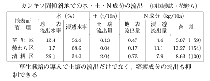 1)草生栽培の目的は,先に述べた目的だけでなく,除草剤を使用しない,肥料の流亡を防ぐことができる,といった現代的な課題にも対応した栽培法である(島根農試・小豆澤斉先生など)。