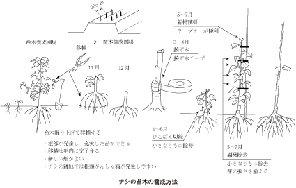 さて,これまで果樹農家にとって苗木とは購入するものであった。しかし,ナシの各産地では自ら苗木の養成に挑戦する農家が多くなっているようだ。そこで,その試みを是非とも成功していただきたく,「苗木の養成と取扱い方」をテーマに鳥取園試・北川健一先生に執筆していただいた。圃場に合わせた台木の選択から,種子の採取方法,完成した苗木の取扱い方の注意点など詳細に解説されている(しばしば,取扱い方が悪いために養成に失敗する例も多いようである)。