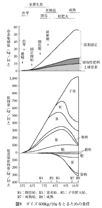 今追録で,「米で安定して600kgとれるのだから,ダイズでも400kgとれて同等」という大山卓爾氏(新潟大学)に,ダイズの養分吸収の研究から新しいダイズのとらえ方を提起していただいた。それによると,子実生産のために大量の窒素を要求するダイズだが,困ったことに,子実生産の時期になると施した窒素を吸収しなくなる性質を持っているのである。つまり,ダイズ多収のカギは,いかに窒素をじょうずに吸収させることができるか,なのだ。