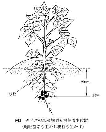 これは播種位置の直下20cmに被覆尿素を施す方法で,初期は溶け出す量が少ないため根粒菌への影響は少なく,大量の窒素が必要な子実生産の時期に供給できるという。溶け出した尿素は速やかにアンモニアに分解されるが,施肥した位置が深いために硝酸態窒素になりにくく,アンモニア態窒素のまま土に吸着される。このため窒素に敏感な根粒菌の発達や活力に悪影響を及ぼすことが少ない。また,被覆尿素(100日タイプ)は子実生産のころに60%が溶け出すため,アンモニア態窒素の形でダイズにスムーズに吸収されるというわけである。20%以上の増収効果が得られている。