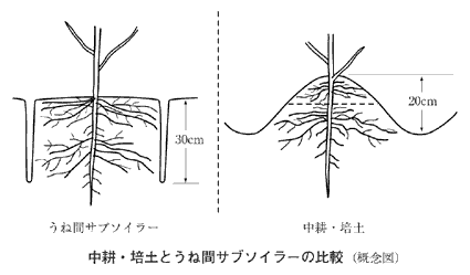 昨年のダイズの改訂に続いて,「ダイズは地力消耗作物だ」と提起した有原丈二氏(作物研究所)に,ダイズの能力を発揮させるための土つくり方法についてまとめていただいた(第6巻)。水田転換畑でのイネの栽培様式(無代かき,部分耕起,不耕起,乾田直播など)や有機物投入と窒素肥沃度の関係について解析し,さらにダイズ作の栽培技術(播種方法,中耕培土など)も具体的に紹介している。また莢先熟については,「乾燥年での中耕・培土による断根での干ばつ害の助長」ではないかと指摘し,図のように,根を切らずに土壌通気性改善効果を引き出す,サブソイラーを利用した省力的方法を紹介している。
