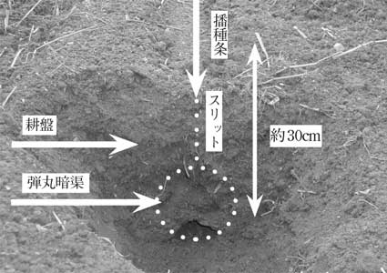 その応用技術として開発されたのがスリットダイズ播種機で,心土破砕処理を播種時に済ませてしまおうというものだ。ロータリーにサブソイラを組み合わせて牽引抵抗力を軽減し,播種しながらスリットと弾丸暗渠を同時に行なう。慣行区に比べて直根が長く深くまで伸びて,直根基部への根粒着生も密だという(落合幾美氏 愛知県農総試)。