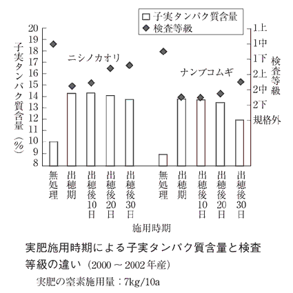 結論をいうと,既存品種では‘ニシノカオリ’と‘ナンブコムギ’。この品種を用いて出穂後10~20日に実肥を施すことにより,タンパク質含量を大幅にアップすることができ,製パンに必要とされる子実タンパク質含量12%以上を実現している。しかも施肥時期を工夫することで,検査等級の低下も小さくてすんでいる(右ページ図参照)。