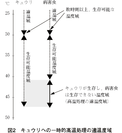 従来は作物が栽培されていない状態で行なわれていたものを,作物の立毛状態で行なおうという技術である。佐藤達雄氏(神奈川県農総研)は,作物へのダメージを最少に抑えながら,害虫や病原菌を抑える温度と暴露時間を,キュウリの場合は「45℃,1時間」と報告している(第1巻)。ミナミキイロアザミウマ,オンシツコナジラミ,ハモグリバエなどの害虫,うどんこ病やベト病などの病原菌に効果がある。