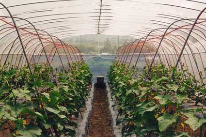 福島県の夏秋キュウリ産地で問題になっていた急性萎凋病に対して,農家とJAと普及センターとが共同で開発した技術である。目合い1mmのネットを,従来の支柱の外側に簡単なパイプ支柱を組んで浮きがけするという方法である。