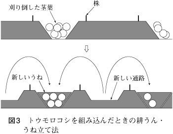 輪作というと大規模な輪作を想像するが,現在のように直売所や産直が盛んになると,小規模でこまめに作物同士を組み合わせていく知恵が光る。第8巻の土つくり事例(施設)に収録した三重県の青木恒男氏のストック栽培事例は,まさに輪作による作目選択と不耕起・耕起をじょうずに組み合わせて少量・多品目生産を実現している例である。うねを巧みに使い,残肥料を考え,作目同士の組合わせを考える。「不耕起うね連続栽培」「不耕起うねの低コスト酸性改良法」「ブロッコリー2条2本植え・2期作栽培」「輪作の要としてのトウモロコシ」(図3)など,青木氏のアイデア満載である。