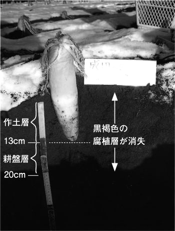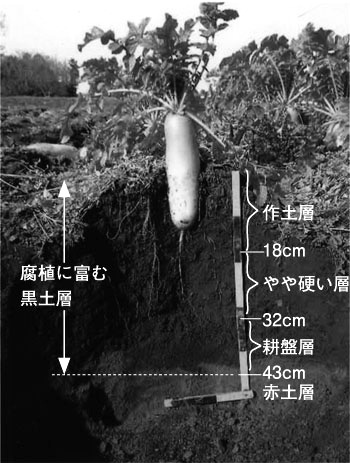 左の生育良好のダイコン畑の断面は,地表から40cm以上の深さまで腐植に富んだ黒い土で,直根は下方に真直に伸び,43cmより深い赤土の部分にまで達している。断面の硬さを判断する「人差し指判定法」では,うねの表面から18cmまでは軟らかい作土層があり,その下32cmまでがやや硬い土層で,よく現場で話題に上る耕盤層は32~43cmに存在していた。