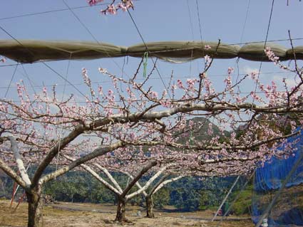 熊本県のモモのネット+平棚栽培のようす