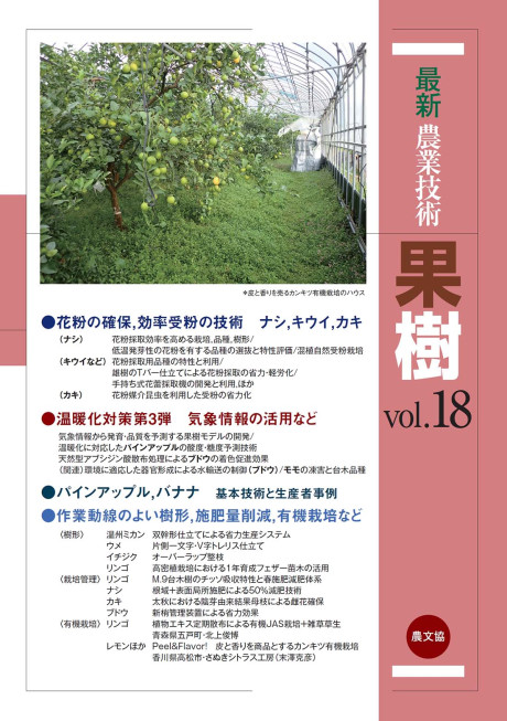 花粉安定確保の工夫と省力受粉法、気象情報をもとに発育・品質を予測する「果樹モデル」の対温暖化活用事例、パインアップル・バナナの栽培、リンゴ・ナシでの施肥量削減、作業動線のよい樹形・整枝法などを紹介。