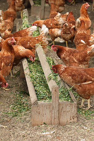 有畜複合の有機農業を営む,茨城県石岡市の宇治田一俊さんの事例を収録しました。採卵鶏700羽(ボリスブラウン),畑1ha,水田20aの経営。宇治田さんの鶏飼育の特徴は,栄養価の高い牧草を細断して毎日豊富に給餌していること。鶏が健康に育ち,年間通じて産卵率80%を超える高い生産性を実現しています。