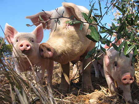 豚肉は全量直売。子豚は放牧で健康的に飼い,抗生物質を使用しないことで消費者との信頼関係を築いています。