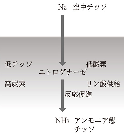 チッソ固定反応を進める酵素(ニトロゲナーゼ)は,土壌中のチッソと酸素が乏しく,エネルギー源となる有機物(炭素)とリン酸が多い条件で活性化する