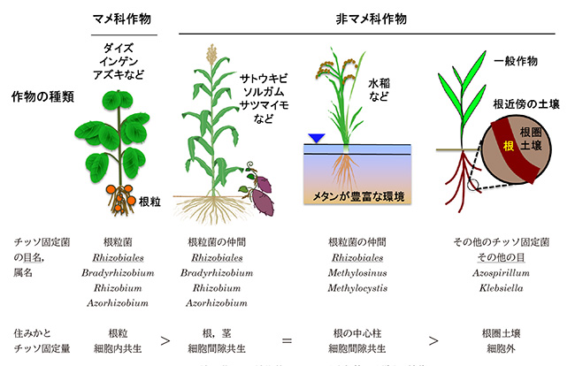 図4 マメ科,非マメ科作物のチッソ固定菌の種類と特徴