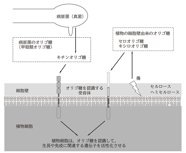 本追録ではバイオスティミュラントも重点的に取り上げた。バイオスティミュラントは植物を環境ストレスに強くするもので,生物刺激剤ともいわれる。最新研究によると,ボカシ肥に含まれる乳酸菌抽出液(分泌液)は直播イネの苗立ちをよくする(「乳酸菌による水稲発芽時の嫌気・低温ストレス耐性付与効果」小鑓亮介氏(雪印種苗株式会社)。甲殻類の殻や植物の細胞壁由来のオリゴ糖はトマトやキュウリの病気を抑える(「オリゴ糖による作物の生育促進と病害抑制効果」竹本大吾氏・名古屋大学,図5)。アブラナ科の辛味成分がキクの日持ちをよくする(「植物の気孔開口を抑える辛味成分のしくみと利用」相原悠介氏・神戸大学/木下俊則氏・名古屋大学)。ミントなどの匂い成分が天敵を誘引する(「ミントの匂いによる害虫抵抗性強化,天敵の誘引」有村源一郎氏・東京理科大学)。バイオスティミュラント研究はまだあるが,今回は生産現場に役立ちそうな研究の一部を収めた。
