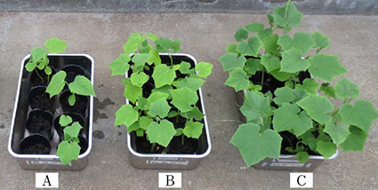 写真1 ピシウム病菌感染土壌でのキュウリ幼苗の生育