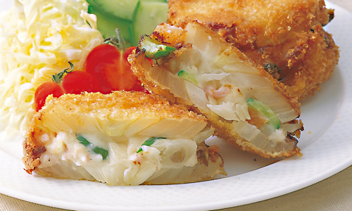 ポテトサラダをタマネギで挟んであげるだけ 衣をつけたら冷凍保存すれば、作りおきも可能
