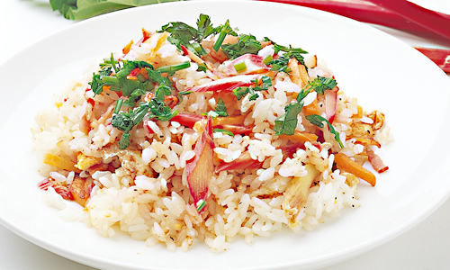 ルバーブの酸味がおいしいさっぱり味のチャーハン きれいな赤が映えて夏場の食欲のない日にもおすすめ