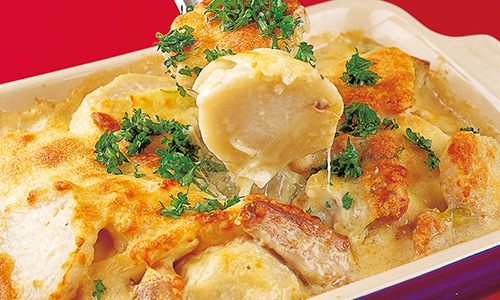 サトイモのぬめりを活かすからホワイトソース作りの手間も減る/サトイモとチーズ、長ネギの相性がぴったりで、「とろ~りホクホク」の食感が楽しめる