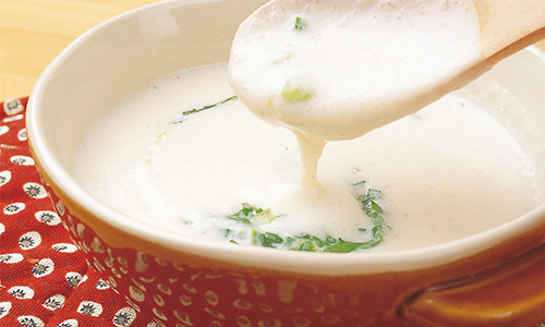 炊いたご飯と茹でたカブをミキサーにかけて、つぶす/味つけにコンソメではなく鶏ガラスープの素を使うので、色がつかず、きれいな白い色のスープに