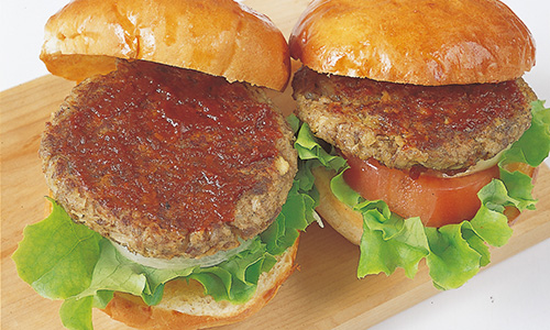 イノシシ肉のくさみをとるために、ゴボウとショウガで煮込む/野菜ごとイノシシ肉をミンチにするおかげで、やさしい味わいのヘルシーバーガーだ
