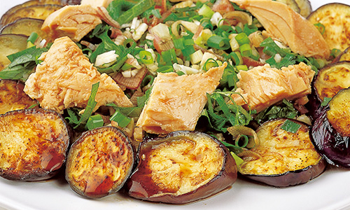 素揚げしないで少量のオリーブオイルで焼くのでヘルシー/焼いたナスがとろりとするいっぽう、薬味とポン酢のおかげでしつこさがなく、いくらでも食べられる
