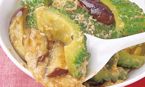 ちりめんじゃこを炒めたところへナスとニガウリを入れてもいい/ニガウリは厚めで歯ごたえがあったほうがおいしいという