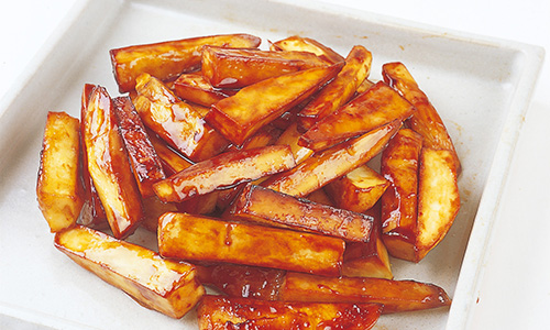 オイスターソース。広東料理でよく使われる、カキを主原料にした調味料/油をしっかり切ると、冷めてもおいしい/サツマイモなのにおかずになり、男性にも喜ばれそう