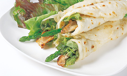 生地の上に材料をのせていく。生地のもちもち感を残すには焼いたあとに布巾をかけておく。アスパラは皮をむくと噛みきりやすい/アスパラドッグは片手でも食べやすい