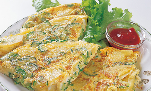 水っぽさをなくすため、キュウリは塩もみして水分をとる/コクを出すため、卵に生クリームを加える/黄色のオムレツに緑色のキュウリが映えて、見た目にもおいしそう