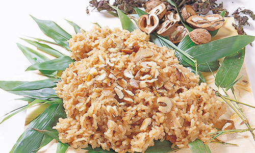 乾燥シソを煎じてシソ水を作る/上からクルミをかけると、まろやかなアクセントがついておいしい