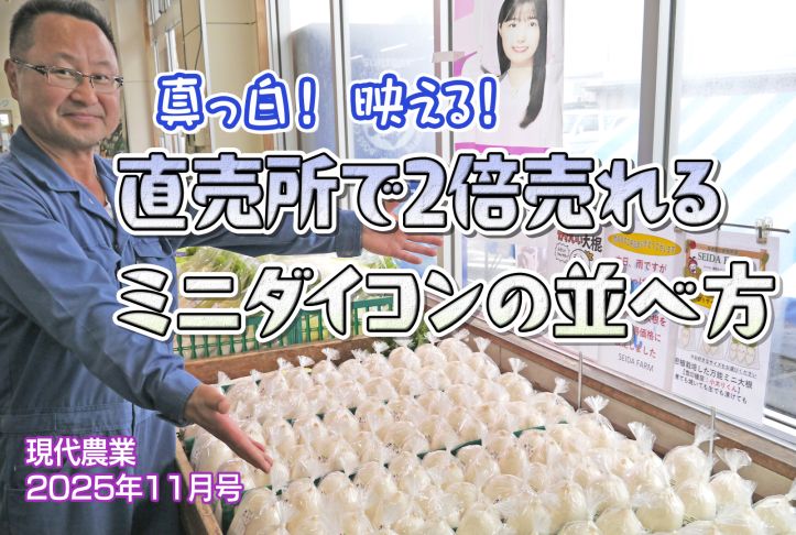 ミニダイコンを専門にしている神奈川県の直売所農家・清田悟志さんに棚つくりのコツを見せてもらいました。仕切り板を多めに入れて1袋1袋を立て、見やすく並べるとともにダイコンの葉を付け根から落とすことで白さが目立つ「映える」棚に。