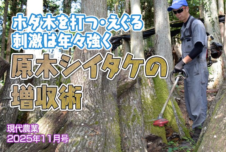愛媛県の高橋征敏さんは、シイタケのホダ木(原木)に刺激を与えることで増収を実現!発生2年目にはナイロンコードの刈り払い機で叩き、3年目にはナタで表皮に傷をつけます。こういった刺激で生命の危機を感じるのか、シイタケ菌が子孫を残すためキノコをより発生させてくれるそうです。
