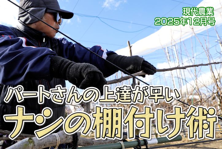 栃木県のナシ農家・青木武久さんは、主枝の背中から伸びる直上枝を樹勢強化に活かし、結果枝にも利用しています。直上枝の誘引作業では、枝を折って棚付け!このやり方は捻枝より簡単で、かつ水平に棚付けできます。いまではパートさんもマスターして、冬の作業の効率が上がったそうです。