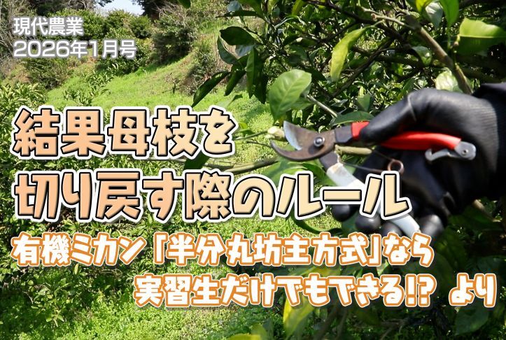 ミカンの隔年結果対策にもなる栽培方法「半分丸坊主方式」は、せん定が簡単で外国人実習生もすぐマスターできる!?熊本県の農家・河野大樹さん、裕子さんご夫妻に、そのせん定ルールを教えてもらいました。