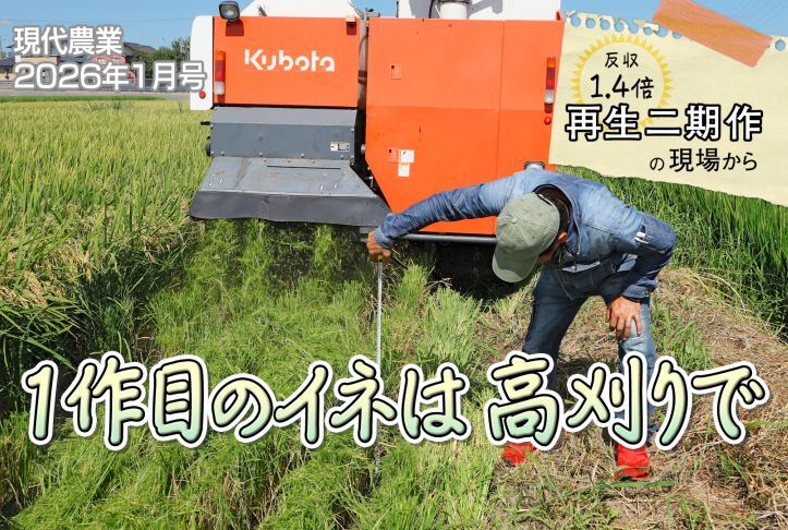 (株)ユーアスの代表・熊谷道久さんに福岡県上毛町で取り組む再生二期作(※)の収穫作業を見せてもらいました。2作目の生育のためには1作目の刈り高さが大切とのことです。※イネの収穫後に刈り株から出てきた2番穂(ひこばえ)を、その後もう一度収穫する栽培方法