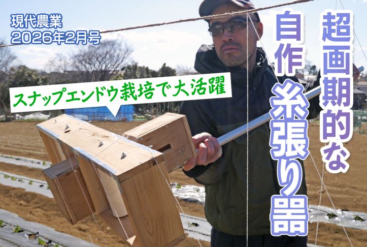 神奈川県の有機農家・古川原琢さんが画期的な糸張り器を自作!スナップエンドウをはわせる網を、1ウネ25m10分で張れる優れもの。キュウリネット代わりになって、片付けもラクラクだそうです。